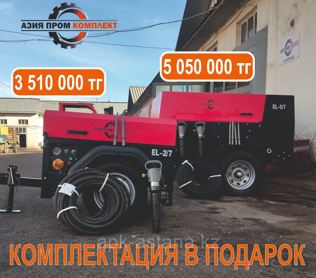 В ПОДАРОК: комплектация — 2 отбойных молотка, 4 пики и 1 бухта рукава напорного.